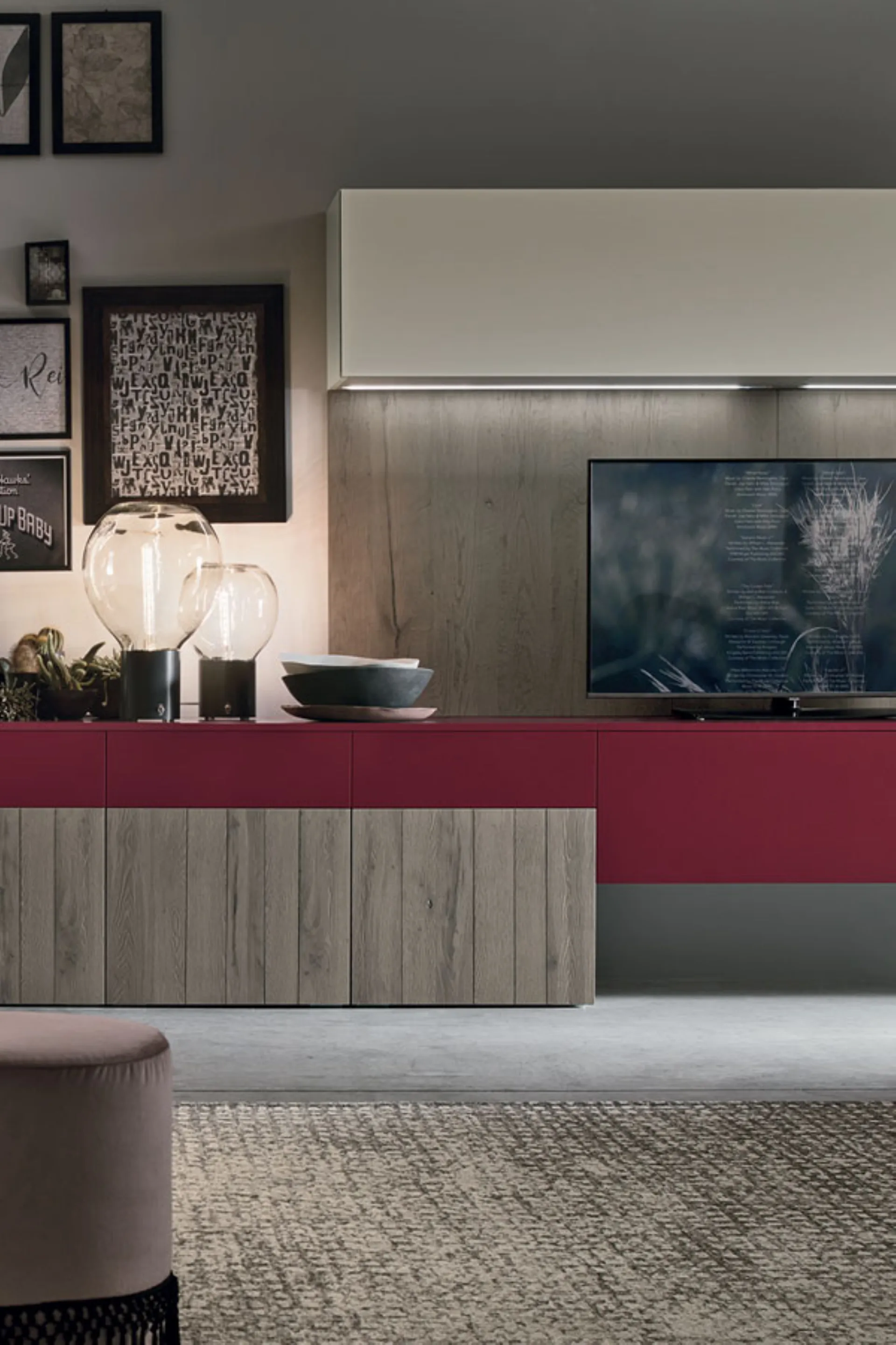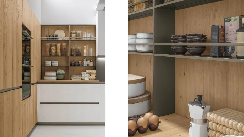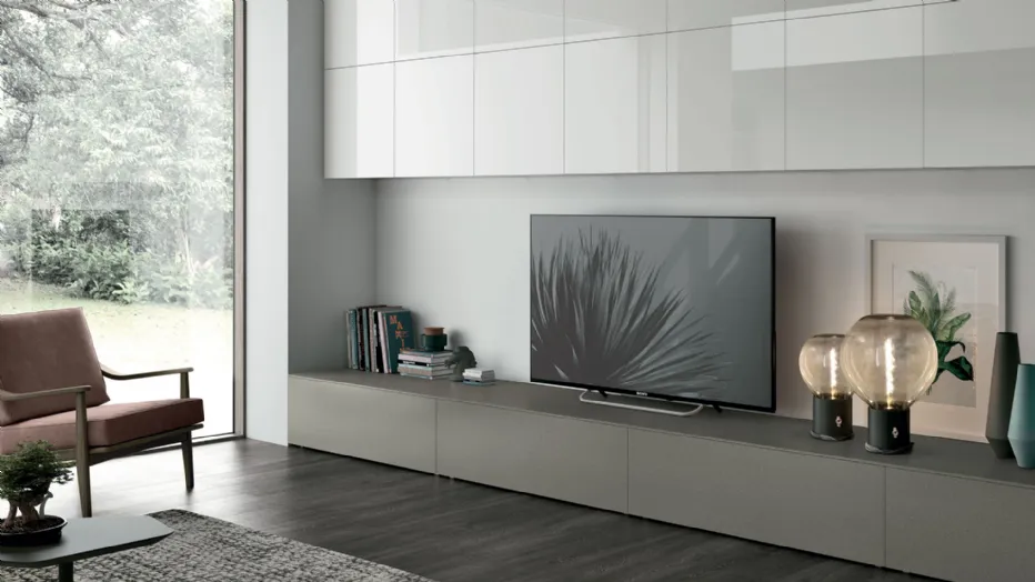 Le pareti attrezzate di Stosa portano lo stesso nome di alcune fra le cucine prodotte dalla stessa azienda, proprio perché c’è una precisa corrispondenza stilistica, strutturale e cromatica. Semplicemente, cambia l’utilizzo: ecco quindi che le basi sospese con ante diventano mobili porta tv e al contempo pratici vani contenitivi, ecco gli stessi top e schienali che arricchiscono l’insieme, ecco le vetrine che aggiungono un tocco in più di luminosità ed eleganza, offrendo la possibilità di esporre gli oggetti più cari e preziosi.